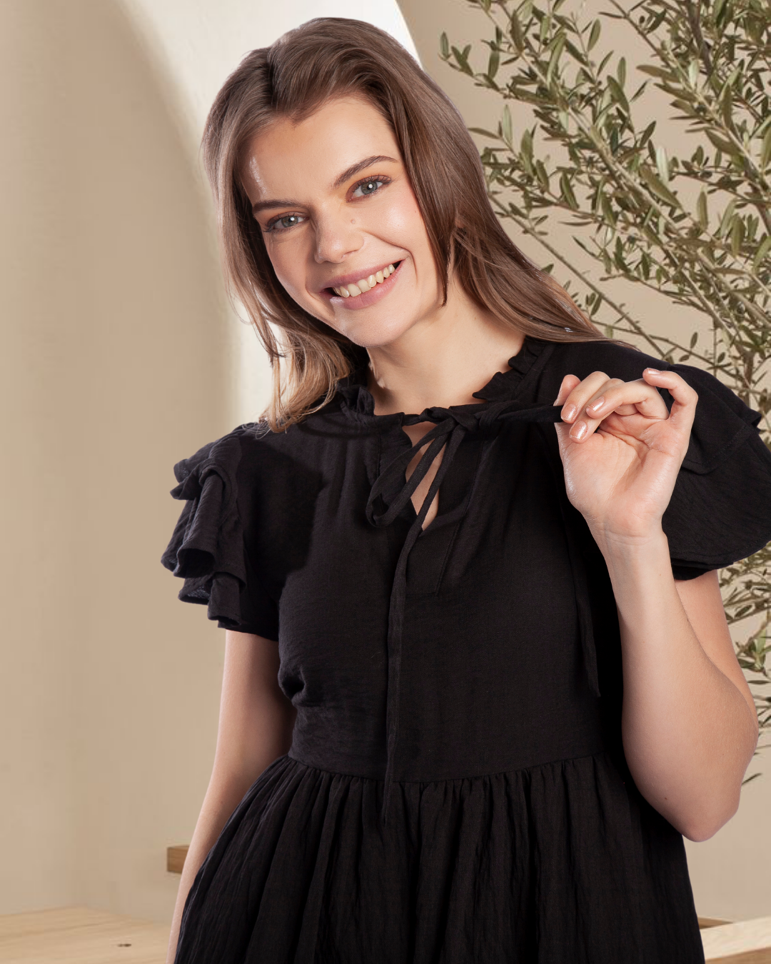 Luce fresca y con estilo con este vestido oversize a la rodilla. Su diseño en capas con estampado y mangas cortas con boleros aporta un toque femenino y moderno, ideal para cualquier ocasión.
